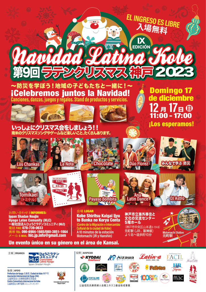 Por noveno año, y gracias al apoyo de nuestros auspiciadores, artistas y entidades de apoyo; Comunidad Latina Hyogo (HLC) anuncia la realización del evento cultural «Navidad Latina Kobe 2023».
