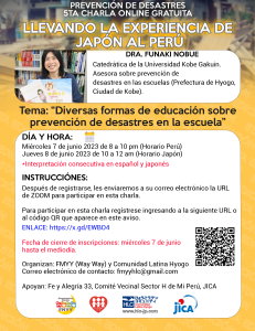 Día y hora:Miércoles 7 de junio 2023 de 8 a 10 pm (Horario Perú)/ Jueves 8 de junio 2023 de 10 a 12 am (Horario Japón)