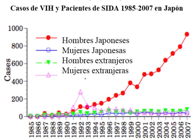 El virus del VIH fue identificado en 1983, hasta entonces sólo se sabía que era mortal. En Japón, se sigue un registro del número de infectados anuales desde 1985. A principios de los 90 se registran infecciones en residentes extranjeros, sobre todo mujeres, el gráfico muestra un pico en el número de infecciones en mujeres extranjeras en 1992.