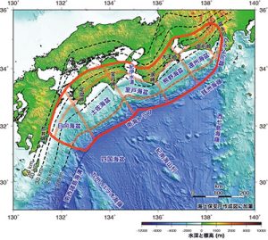 Gran terremoto de la falla Nankai: El 30 de agosto del 2012 la Oficina del Gabinete de Japón emitió un comunicado en el que informaba que desde hace varios años se prevé que se produzca un gran terremoto entre la zona de Kanto y Kyushu al que se le conoce como «Terremoto de Nankai» (Nankai Torafu Kyodai jishin). Dicho informe manifiesta que, si dicho terremoto alcanzara una magnitud mayor a 7 grados, son muy altas las probabilidades de que se produzca un tsunami cuya altura máxima, en el peor de los pronósticos, podría llegar a los 34 metros inundando unos 1,015 kilómetros en el litoral comprendido entre Kanto y Kyushu. Estima además que en caso extremo una catástrofe de esta magnitud causaría la muerte de unas 323,000 personas y que los derrumbes e incendios que se producirían dañarían unas 2,386,000 edificaciones. Cabe señalar que no han dado fechas ya que los terremotos no se pueden predecir, ni el lugar donde se producirá, ni su intensidad.
