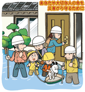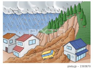 Fuertes lluvias ( ooame 大雨) / Inundación (kousui 洪水) y Deslizamiento de tierra y rocas (doshya saigai 土砂災害): Las fuertes lluvias pueden causar diversos desastres como desborde de ríos, inundaciones y deslizamientos de tierra y rocas. Si se encuentran en un lugar donde el agua se puede acumular fácilmente, debe dirigirse a un sitio alto y no acercarse a canales, ríos o arroyos. Revise el mapa de riesgo (hazard map) y verifique si su vivienda puede ser afectada.