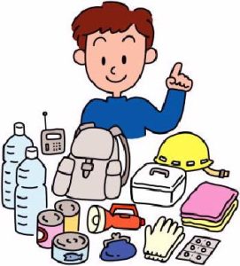 Coloque linterna (Kaichu dento懐中電灯), radio portátil (Keitai radio 携帯ラジオ), alimentos de emergencia (Bishyoushoku 非常食), agua (Nomi misu飲み水), objetos de valor (Kichoujin 貴重品), medicinas (Kusuri 薬), dinero (Okane お金), tarjeta de banco (Kashu kaado キャッシュ カード), pasaporte (Pasupotto パスポート), tarjeta de residencia (Zairyu Kaado 在留カード), tarjeta de seguro (Kenkou Hokenshou 健康保険証 ), ropa ( Fuuku 服), ropa interior (shitagi下着), casco (Germetto ヘルメット), toalla (Taoru タオル), guantes ( Guntten 軍手), etc.