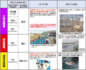 – Si existe el peligro de producirse un tsunami se emitirá un aviso. Hay tres tipos de aviso: precaución (chuihou), alerta (keihou) o alerta especial (tokubetsu keihou).