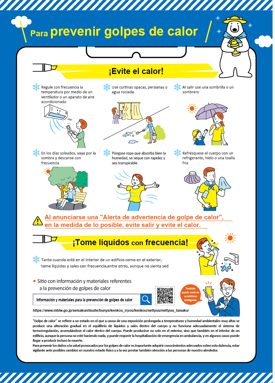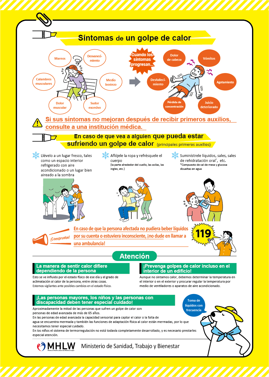 Estas son algunas recomendaciones por parte del ministerio de sanidad, trabajo y bienestar de Japón, con las cuales se busca prevenir el golpe de calor, cómo detectar a alguien que esté experimentándolo para posteriormente aprender cómo ayudarlo en esa situación.