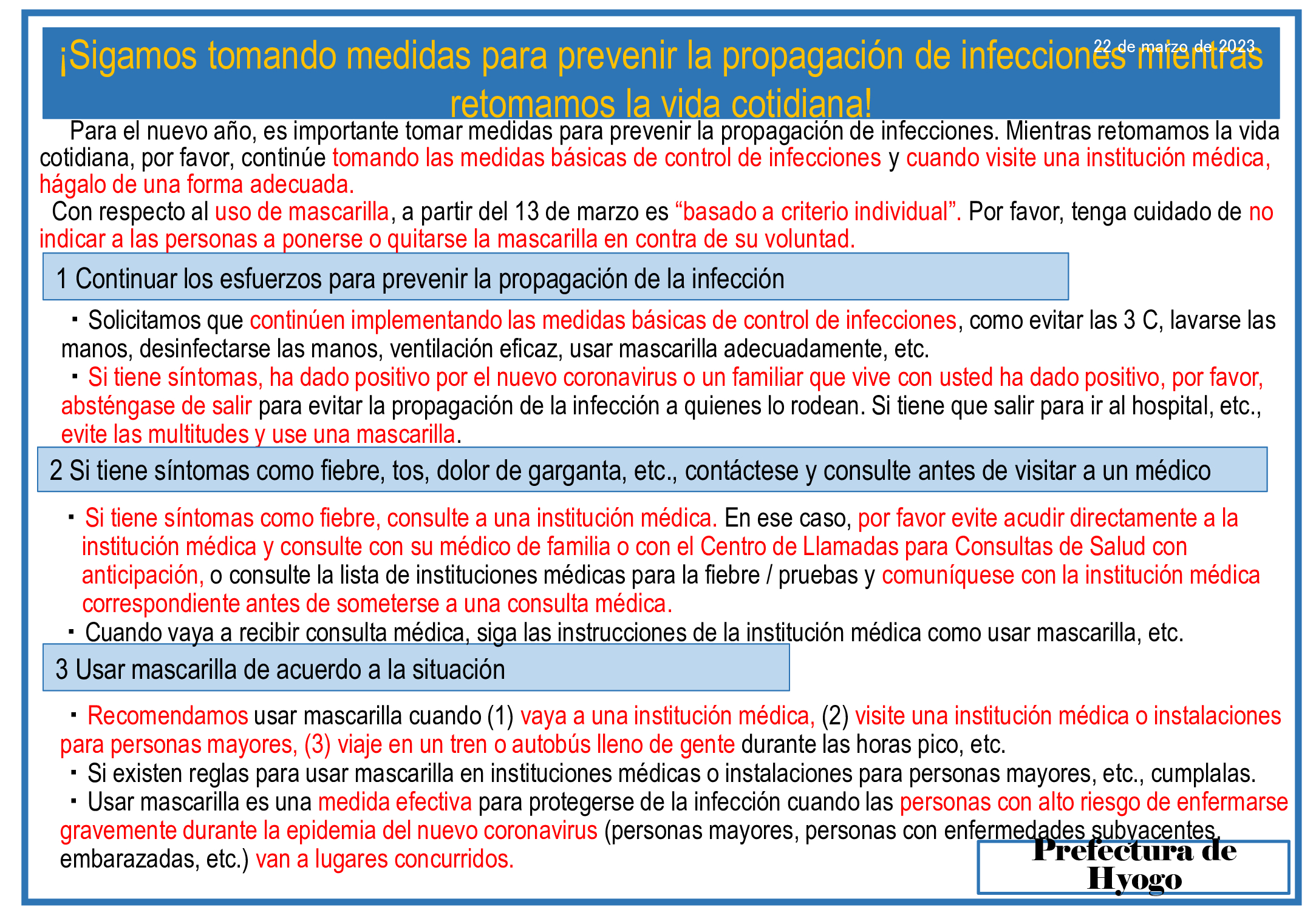 Para el nuevo año, es importante tomar medidas para prevenir la propagación de infecciones. Mientras retomamos la vida cotidiana, por favor, continúe tomando las medidas básicas de control de infecciones y cuando visite una institución médica, hágalo de una forma adecuada.
