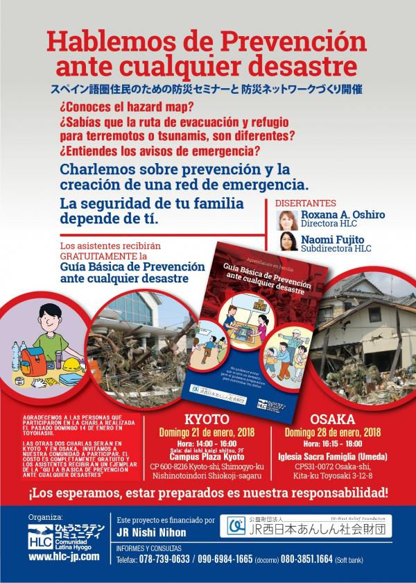 No es mi intención generar miedo a través de estas líneas, sino de que entendamos que es un tema que debemos asumir con responsabilidad, ya que aunque no podamos evitar que ocurra un desastre natural, podemos minimizar los daños si estamos preparados, algo fundamental para nuestra seguridad y los nuestros, motivo por el cual, Comunidad Latina Hyogo (HLC), agrupación que tengo el honor de dirigir, viene trabajando en el tema sobre el cual, realizando un gran esfuerzo y con el financiamiento de JR Nishi Nihon, realizando durante este mes de enero, charlas y distribución gratuita de la «Guía Básica de Prevención ante cualquier Desastre”, en las prefecturas de Aichi, Kyoto y Osaka. Cabe señalar que este es un proyecto piloto que podrá extenderse a otras ciudades en la medida de que ustedes, nuestra comunidad,  respondan con su asistencia.