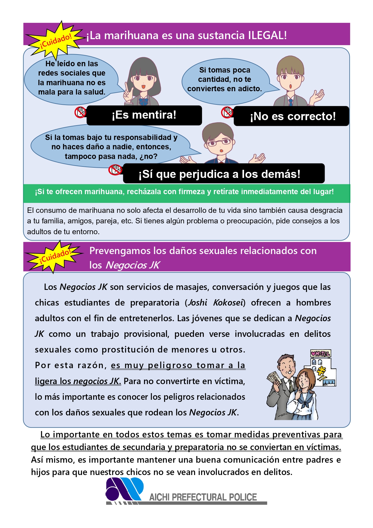 Queremos compartirles una noticia por parte de la policía de Aichi para proteger a los a los menores de delitos, en este caso a tener cuidado con  internet que está lleno de peligro para los menores, La marihuana que es una sustancia ilegal  y los negocios JK (Joshi Kokosei)