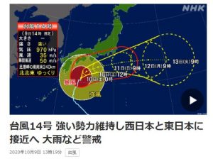 Con respecto a las perspectivas futuras para el tifón No. 14, Satoshi Sugimoto, jefe de la División de Pronósticos de la Agencia Meteorológica, dijo: «El curso esperado del tifón ha cambiado y la posibilidad de tocar territorio japonés ha disminuido, pero debemos estar atentos a las fuertes lluvias».